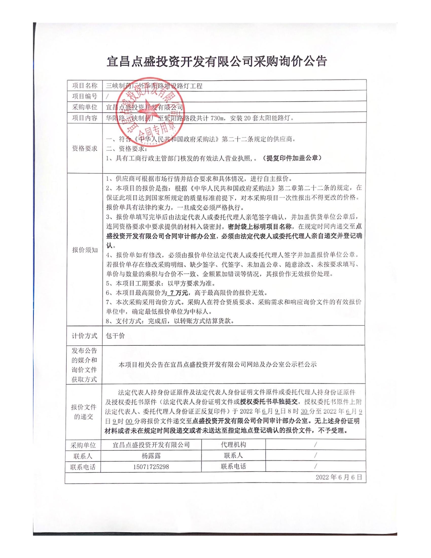 詢價(jià)公告-三峽制藥廠外華陽(yáng)路增設(shè)路燈工程