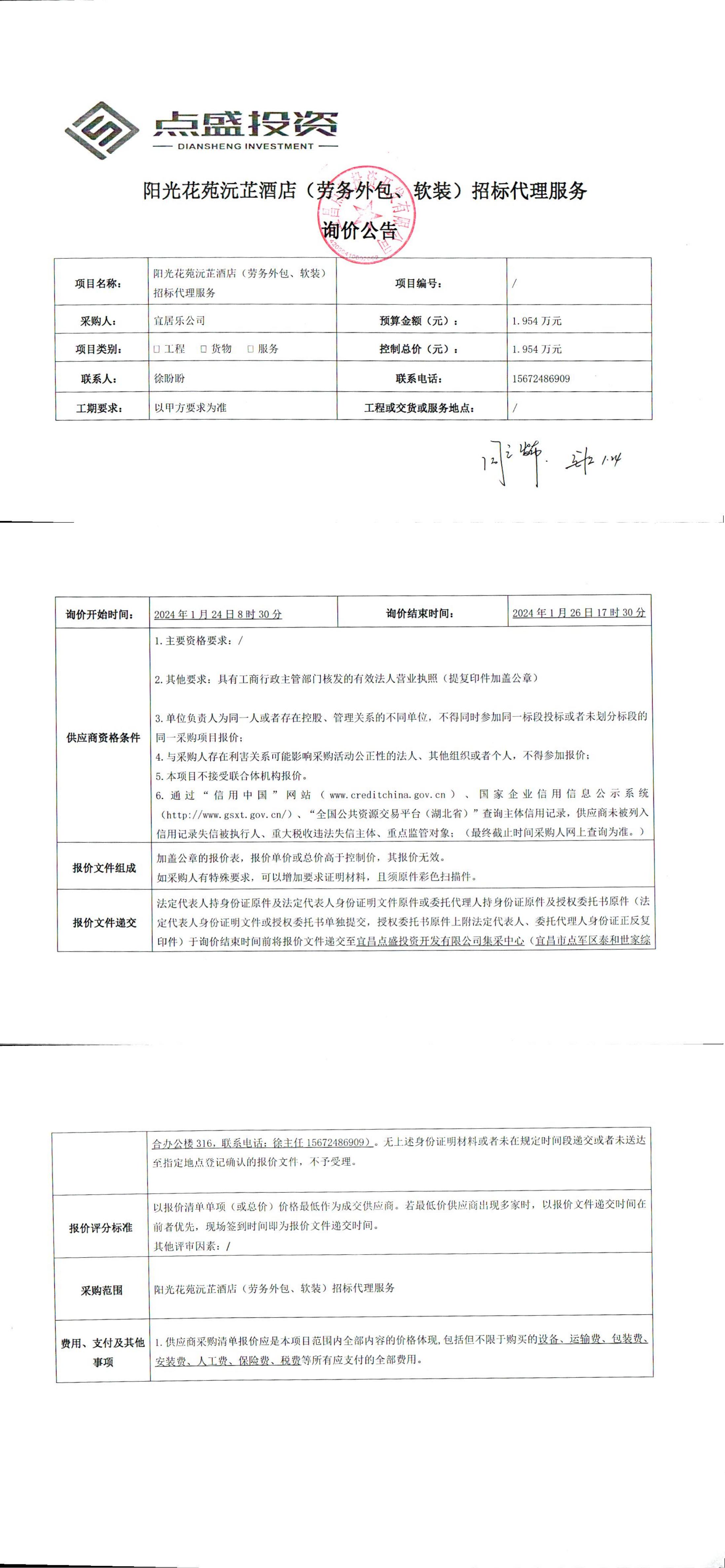 陽(yáng)光花苑沅芷酒店(勞務(wù)外包、軟裝)招標(biāo)代理服務(wù)?詢(xún)價(jià)公告