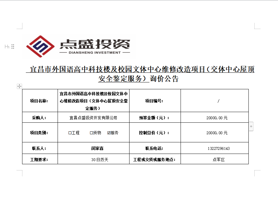 宜昌市外國語高中科技樓及校園文體中心維修改造項(xiàng)目(交體中心屋頂安全鑒定服務(wù))詢價公告