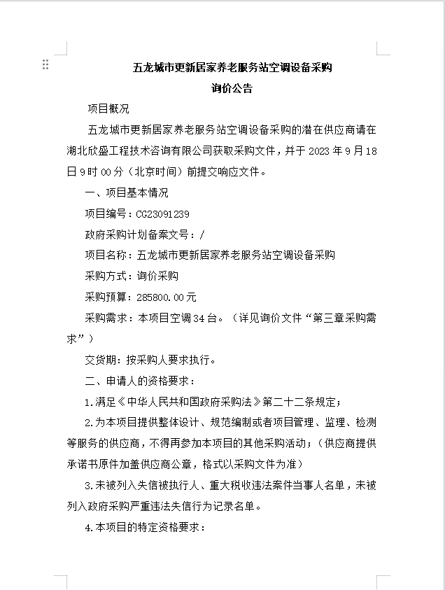 五龍城市更新居家養(yǎng)老服務(wù)站空調(diào)設(shè)備采購詢價(jià)公告