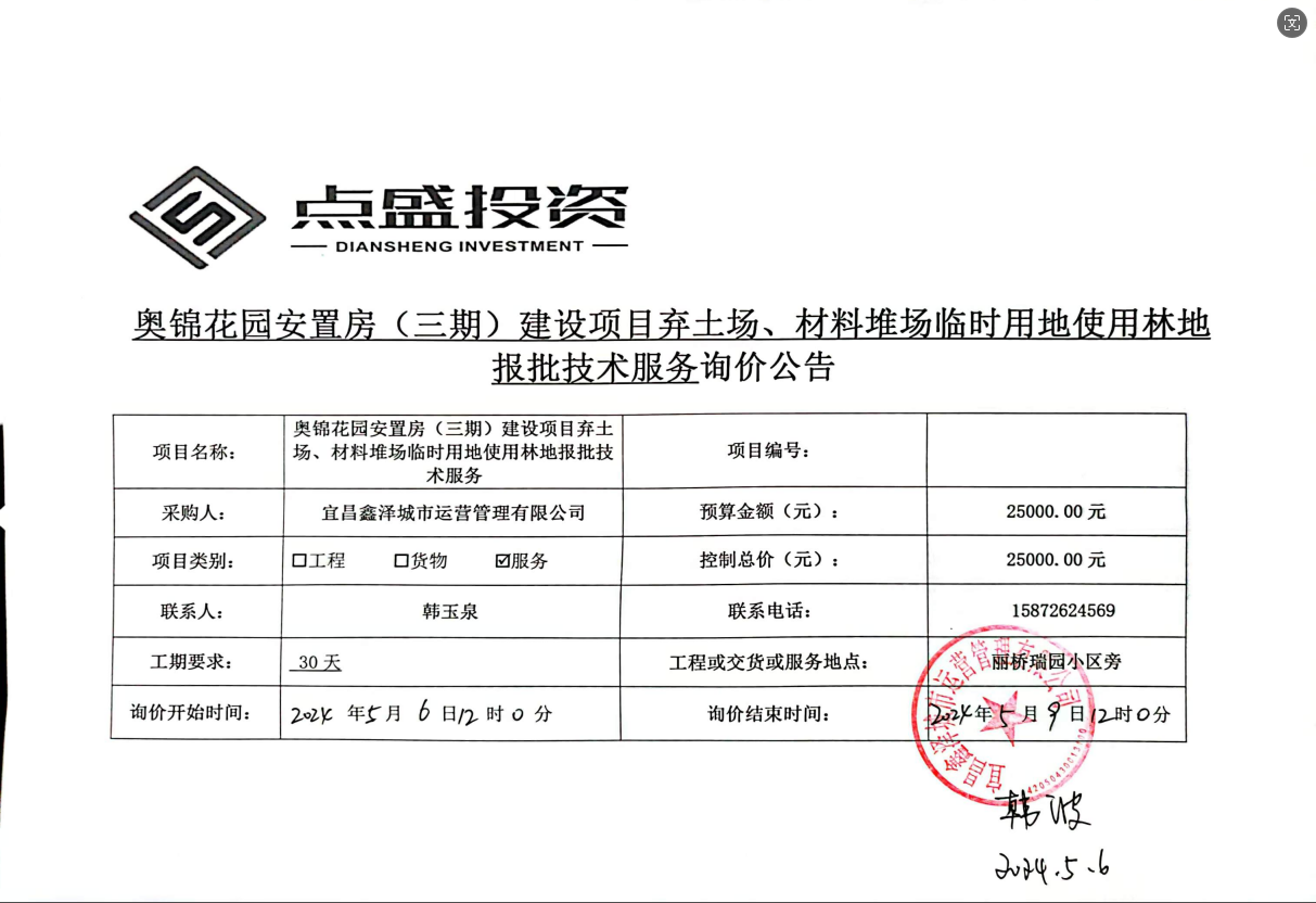 奧錦花園安置房(三期)建設(shè)項(xiàng)目棄土場、材料堆場臨時用地使用林地報(bào)批技術(shù)服務(wù)詢價公告
