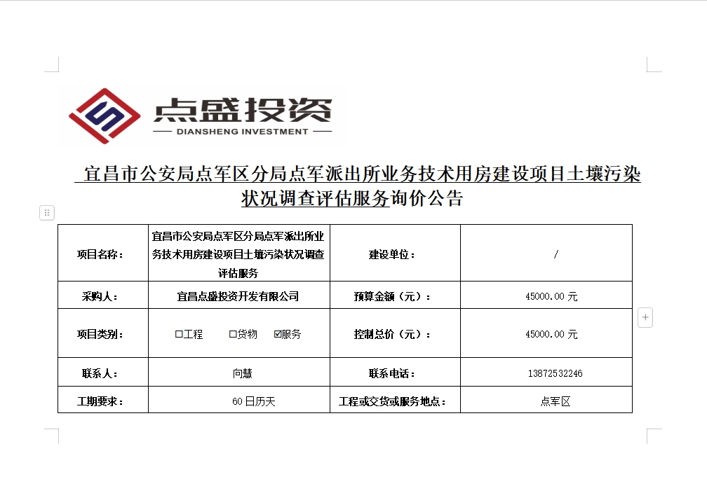 宜昌市公安局點(diǎn)軍區(qū)分局點(diǎn)軍派出所業(yè)務(wù)技術(shù)用房建設(shè)項目土壤污染狀況調(diào)查評估服務(wù)詢價公告