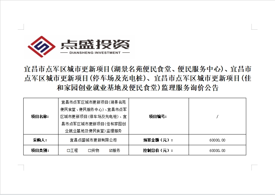宜昌市點(diǎn)軍區(qū)城市更新項(xiàng)目(湖景名苑便民食堂、便民服務(wù)中心)、宜昌市點(diǎn)軍區(qū)城市更新項(xiàng)目(停車場及充電樁)、宜昌市點(diǎn)軍區(qū)城市更新項(xiàng)目(佳和家園創(chuàng)業(yè)就業(yè)基地及便民食堂)監(jiān)理服務(wù)詢價公告