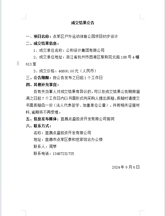 點軍區(qū)戶外運動體育公園項目初步設(shè)計成交公告